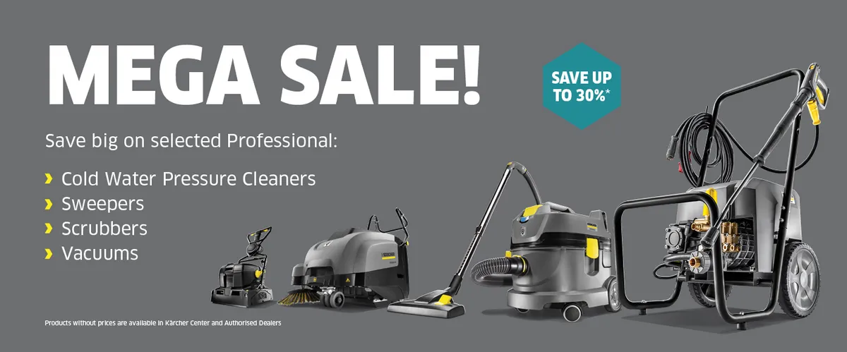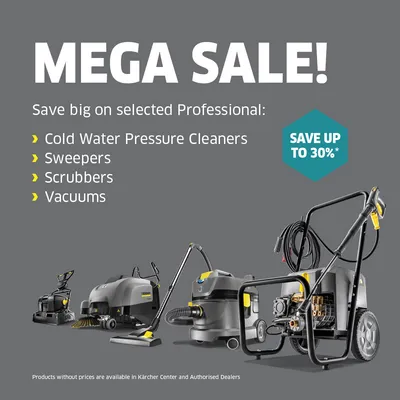 Kärcher Mega Sale is live! Save up to 30% on selected Cold Water Pressure Cleaners, Sweepers, Scrubbers and Vacuums!