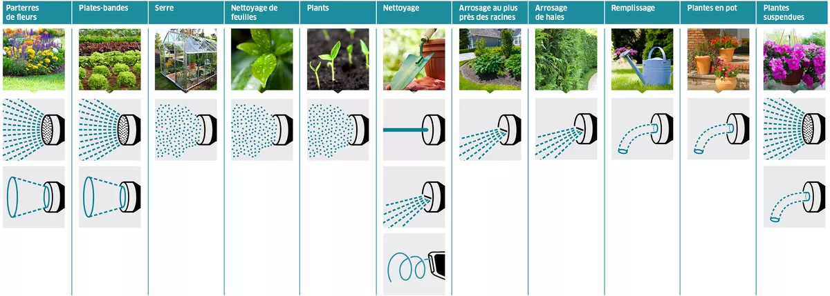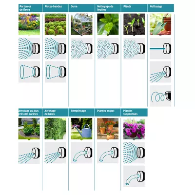 Notre gamme de pistolets offre des solutions adaptées à tous les besoins. Les différentes formes d'arrossage permettent aussi bien l'arrosage facile des parterres de fleurs et plates-bandes que l'élimination des saletés grossières des terrasses ou du mobilier de jardin. Les pistolets sont donc parfaitement adaptés à la fois aux tâches d'arrosage et aux tâches de nettoyage.