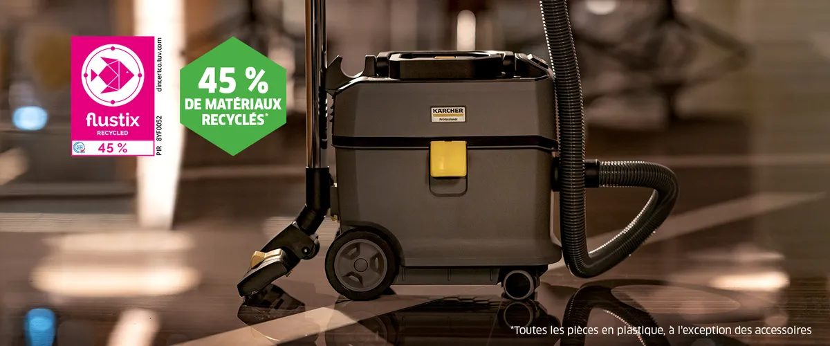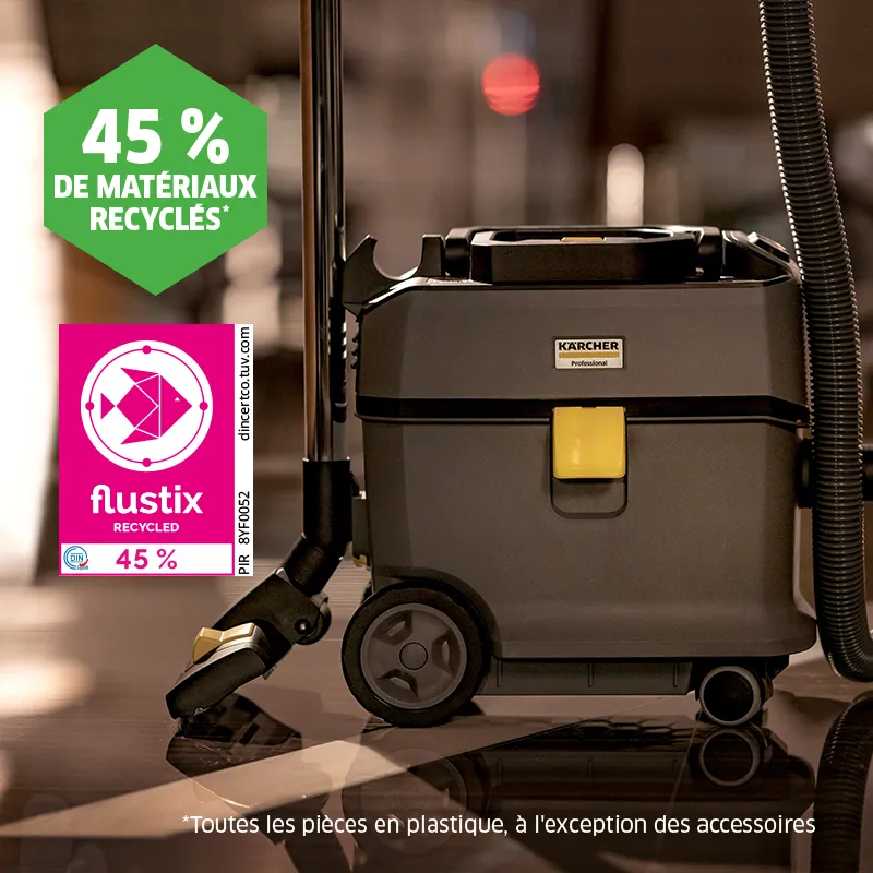 Durable et puissante: la nouvelle gamme modulaire T-Range se distingue par un message clair – elle est écologique et innovante. Les appareils sont constitués à 45% de plastique recyclé. Avec cette gamme, nous misons sur une durabilité réelle ainsi que sur une puissance d'aspiration et une longévité exceptionnelles. Grâce à l'utilisation de matières recyclées, nous réduisons l'énergie nécessaire lors de la fabrication, préservons de précieuses matières premières et économisons jusqu'à 2,0 kilogrammes de plastique vierge par appareil. Le plastique recyclé utilisé est issu de déchets de production comme les rebuts, les chutes et le surplus. Cela permet de prévenir les déchets et d'économiser des ressources naturelles. Le tout sans aucune concession en matière de qualité de la gamme robuste T-Range : le plastique recyclé offre les mêmes excellentes propriétés que le plastique vierge.