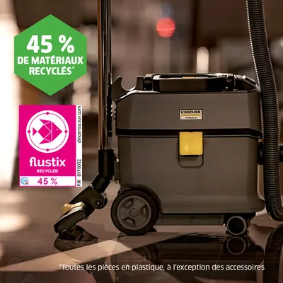 Les aspirateurs poussières de la nouvelle gamme T-Range de Kärcher allient design ergonomique et durabilité réelle. Ils offrent un fonctionnement quasi sans bruit tout en fournissant d'excellents résultats de nettoyage. Ces appareils sont constitués de 45% de plastique recyclé et sont fabriqués dans le respect de l'environnement. Avec une puissance d'aspiration exceptionnelle, un vaste éventail d'accessoires et un rapport qualité-prix attractif, ils satisfont aux exigences les plus poussées en matière d'efficacité et de rentabilité. De conception modulaire, ces aspirateurs sont durables et robustes grâce à un châssis solide, à un boîtier résistant, à des pare-chocs protecteurs et à de grandes roues. Les puissantes batteries Kärcher Battery Power+ de 36 volts assurent une longue autonomie pour les modèles fonctionnant sur batterie. Grâce à un niveau sonore de seulement 52 dB(A) dans le cas des variantes filaires, ces appareils ultra silencieux sont parfaits pour l'utilisation dans les lieux sensibles au bruit comme les hôtels ou les hôpitaux.