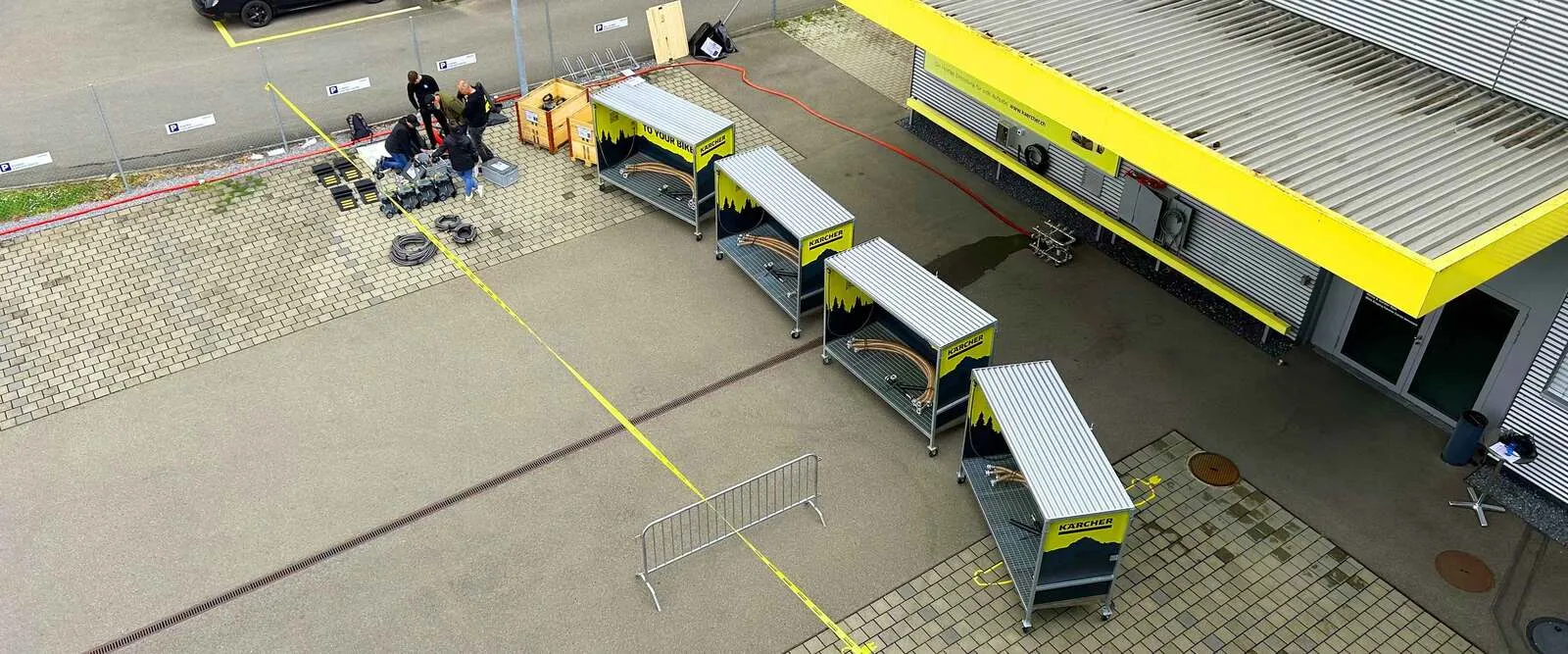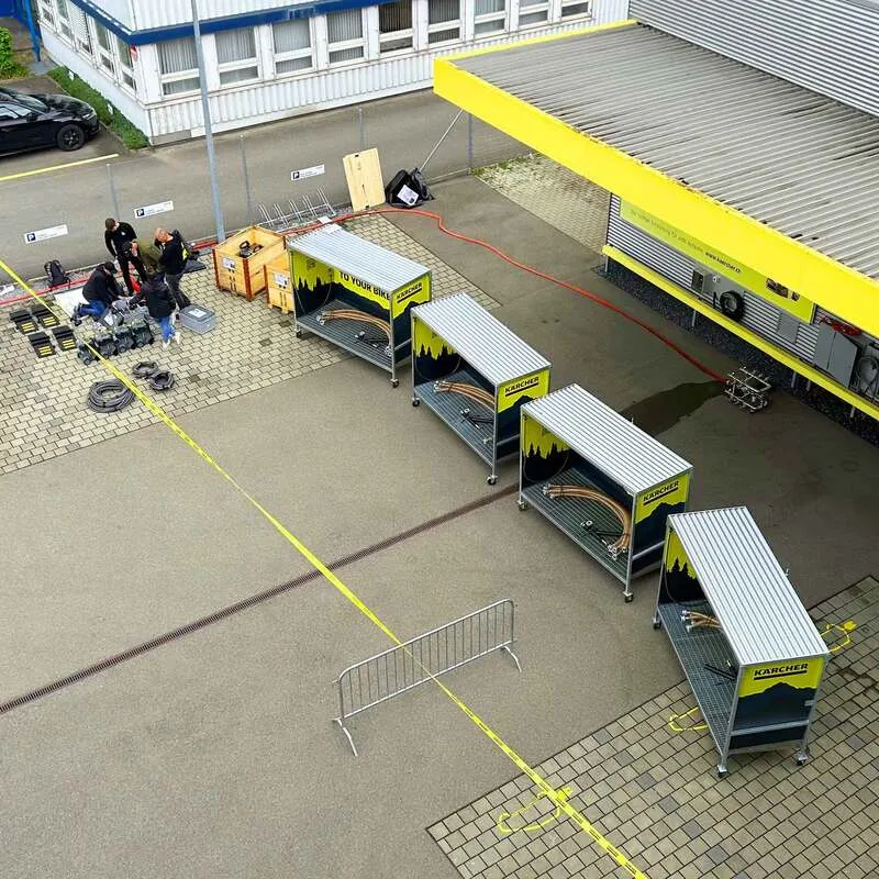 - Wasserschläuche (8 m für die beiden inneren Bike Cleaning Stations und 12 m für die beiden äusseren Bike Cleaning Stations) an der Wasserbatterie anhängen und zu den 4 Waschboxen und Hochdruckreiniger ziehen