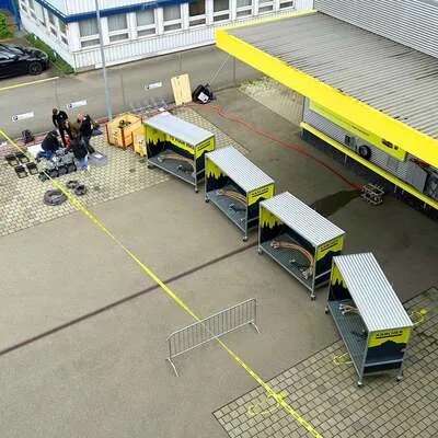 - Bike Cleaning Stations mit Absperrgitter abtrennen und Hussen über die Gitter montieren