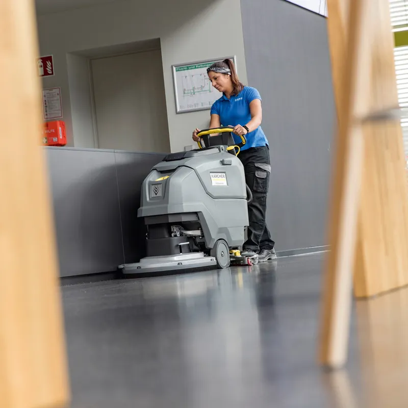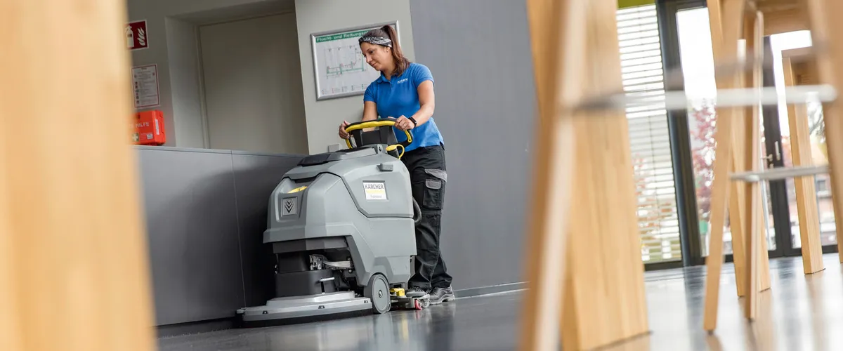 Auf mittelgrossen Flächen, wie im Handel, in Schwimmbädern, Hallen sowie Gängen und auf Fluren vieler Einrichtungen, eignen sich Nachläufer-Scheuersaugmaschinen zur effizienten Reinigung.