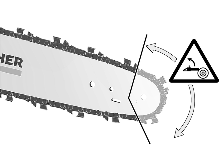 Testere zincirinin kılavuz rayın üst köşesine sıkışması rayın aniden kullanıcı yönüne geri çarpmasına neden olabilir.