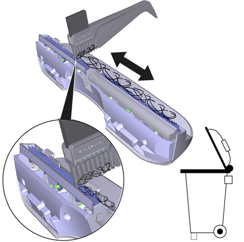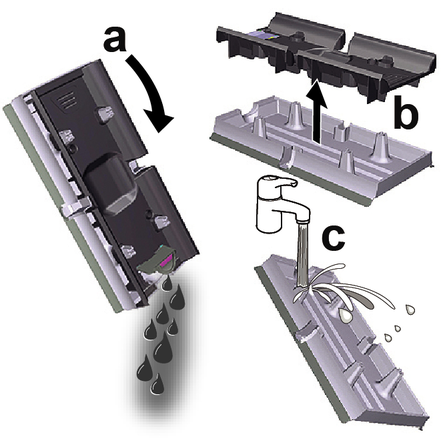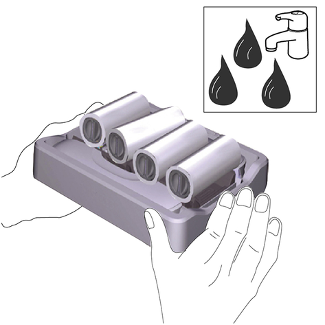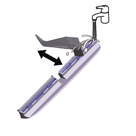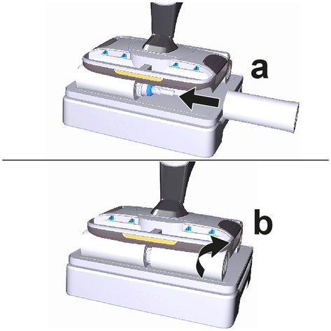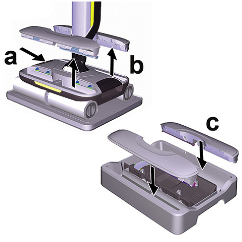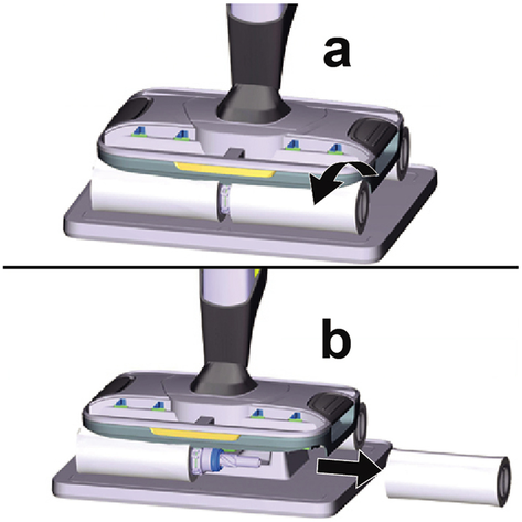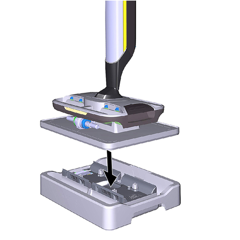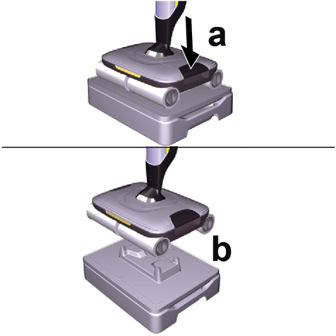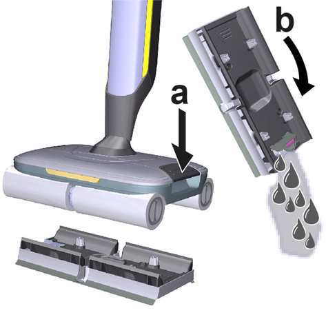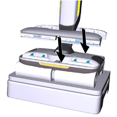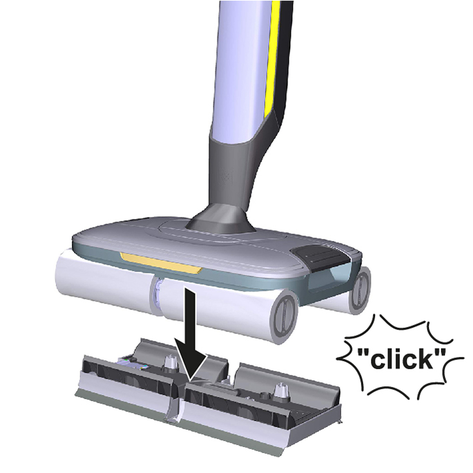 Поместить устройство по центру на бак для грязной воды, чтобы оно было расположено между цилиндрическими щетками и затем зафиксировалось до щелчка. Положение бака не имеет значения, поскольку он может устанавливаться в устройство в обоих продольных направлениях.