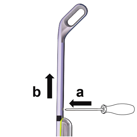 Вставить отвертку под углом 90° в небольшое отверстие на задней стороне рукоятки и снять рукоятку.