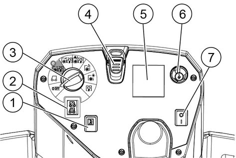 Если оператор покидает сиденье во время работы или во время вождения, переключатель сиденья отключает приводной двигатель после небольшой задержки.