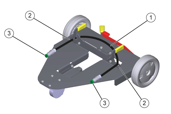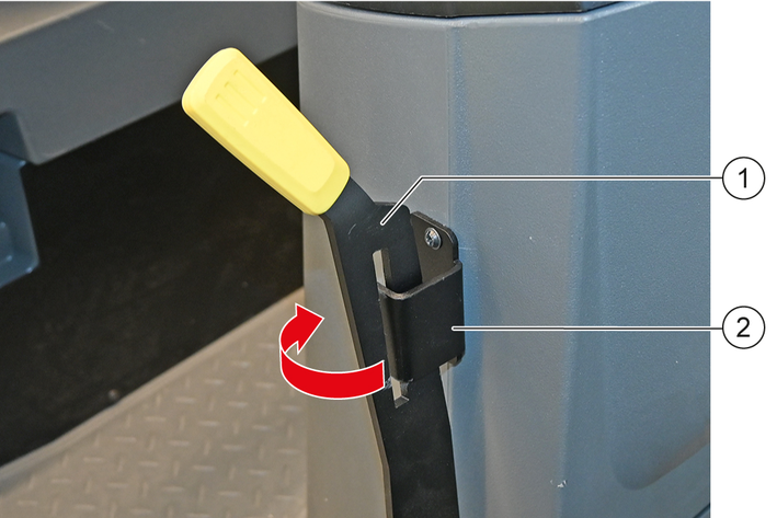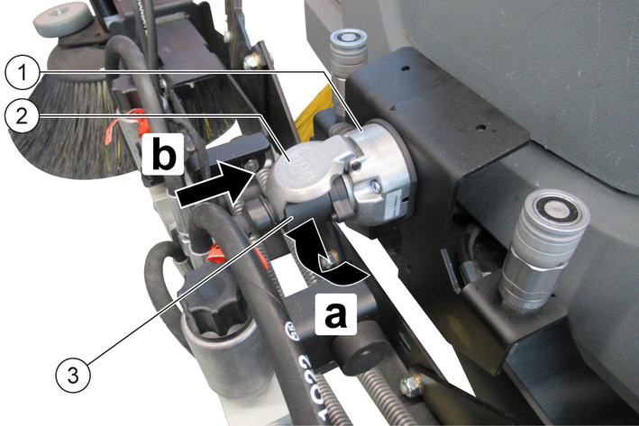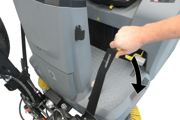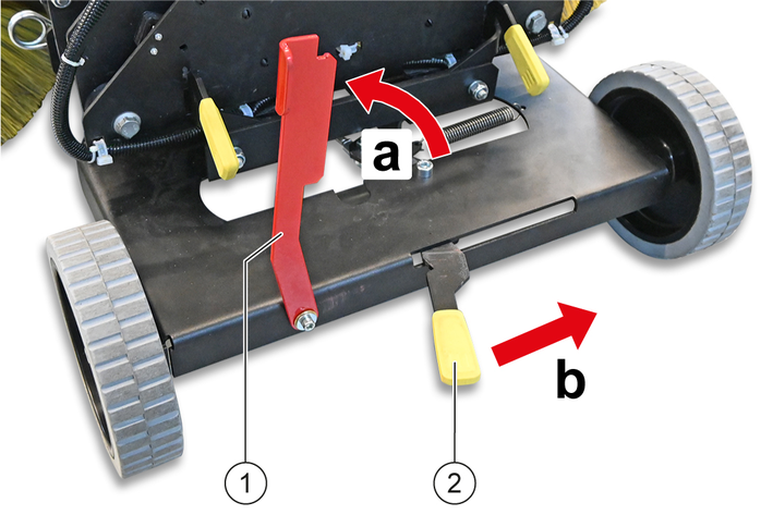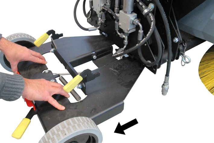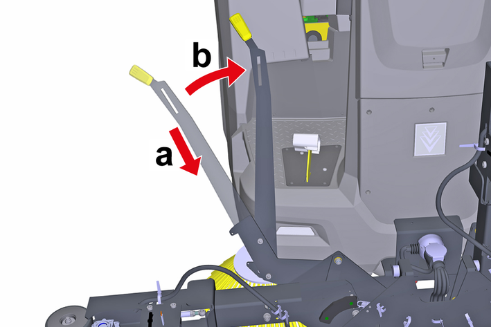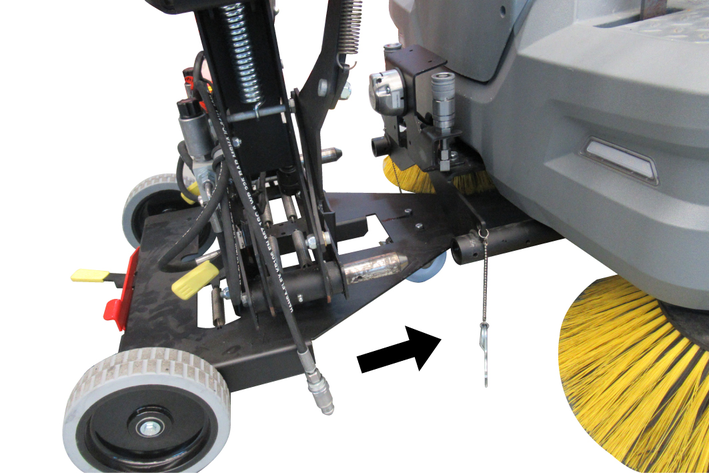 İlave yan süpürgeleri taktıktan sonra taşıma arabasını çıkarın.Makineyi taşıma arabası takılıyken sürmeyin.İlave yan süpürgedeki taşıma arabasının sökülüp sökülmediğini kontrol edin, aksi takdirde taşıma arabasını sökün, bkz. bölüm Cihazın makineye takılması / makineden sökülmesi.