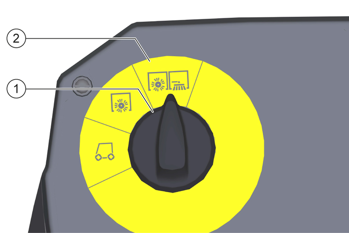 İlave yan süpürgeleri sadece “Süpürme silindiri ve ilave yan süpürge ile süpürme” programıyla birlikte kullanın.“Sürüş” veya “Süpürme silindiri ile süpürme” programlarını çalıştırmadan önce her iki ilave yan süpürgeyi yukarı kaldırın.Program seçim şalterini "Süpürme silindiri ve ilave yan süpürge ile süpürme" konumuna getirin.
