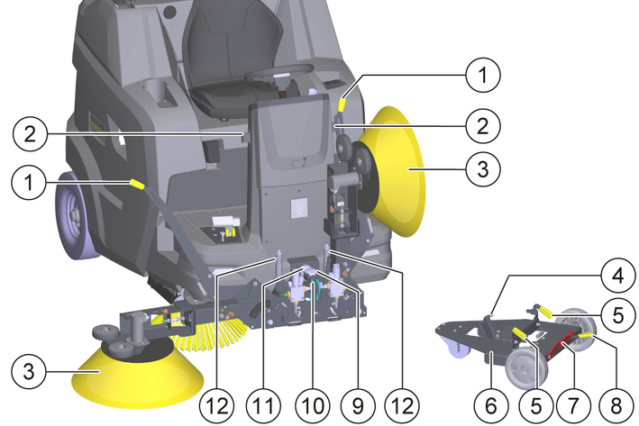 Dönen ilave yan süpürgeler, süpürme alanının köşelerini ve kenarlarını temizler ve kirleri süpürge silindirinin süpürme hattına taşıyan yan süpürgelerin çalışma hattına taşır.