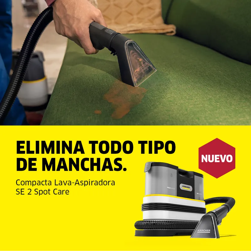 La práctica lava-aspiradora SE 2 Spot es el ayudante ideal para la eliminación inmediata y específica de manchas en tapicerías y textiles. Ya se trate, por ejemplo, de manchas de comida o de bebida, la SE 2 Spot elimina las manchas y los olores de forma rápida y eficaz. Gracias a su diseño compacto, la lava-aspiradora es especialmente fácil de manejar y se guarda en poco espacio. De esta forma está lista en todo momento y rápidamente en caso de suciedad imprevista. El amplio radio de acción gracias al cable de 4,5 metros permite realizar trabajos de limpieza de forma flexible en toda la habitación. Gracias al práctico almacenamiento de accesorios directamente en el equipo, todos los accesorios están rápidamente a mano y listos en todo momento. Incluye cepillo quitamanchas, boquilla para lavado de tapicerías y detergente.