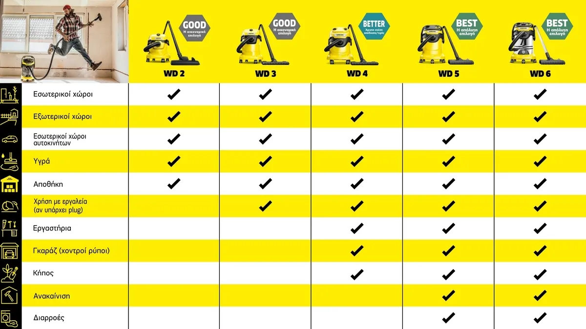 Είτε πρόκειται για ξηρούς ή υγρούς ρύπους, χονδροειδείς ή όχι- στο αυτοκίνητο, στο υπόγειο, στο γκαράζ, στο εργαστήριο ή γύρω από το σπίτι- οι σκούπες ξηρής και υγρής αναρρόφησης της Kärcher θα σε εκπλήξουν με την πολύ-λειτουργικότητά τους. Είναι εξαιρετικά συμπαγείς, έχουν εξαιρετική απορροφητική ισχύ και ενεργειακή απόδοση. Χάρη στον συμπαγή σχεδιασμό τους μπορούν να αποθηκευτούν εύκολα σχεδόν παντού και είναι συνεχώς κοντά για να τις χρησιμοποιήσεις. Οι πολυάριθμες λειτουργίες και η μεγάλη γκάμα αξεσουάρ εξασφαλίζουν τέλεια αποτελέσματα καθαρισμού και μέγιστη ευκολία στην χρήση. Οι μπαταριοκίνητες μηχανές μας μπορούν επίσης να χρησιμοποιηθούν όπου δεν υπάρχουν διαθέσιμες πρίζες.