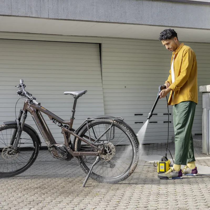 A pressure washer or a medium- or low-pressure cleaner are suitable devices to clean a bike. While the pressure washer usually needs to be connected to electricity and water, the handheld cleaner is battery-powered and therefore only needs a water connection. That’s why it is suitable to use for quick bike cleaning in the garden and wherever there is no power connection nearby. With high and medium pressure, even stubborn dirt can be removed quickly and easily. Battery-powered pressure cleaners are particularly compact and mobile, making them ideal for quick cleaning in between.