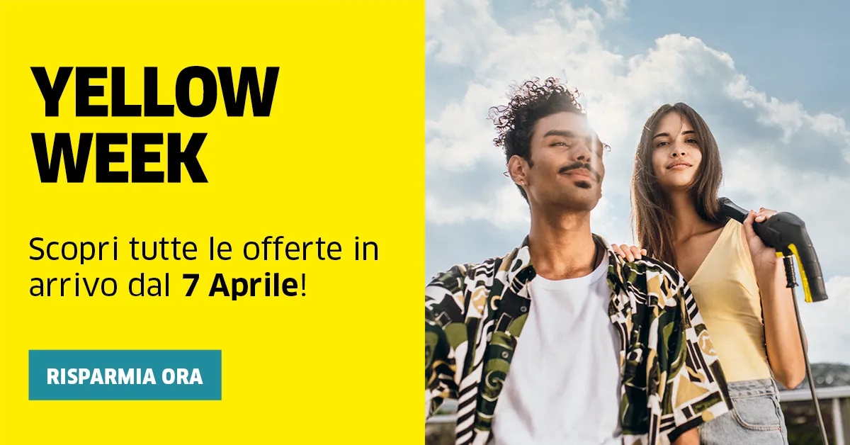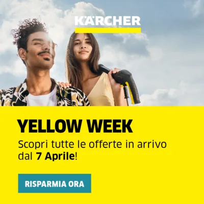 *Offerte valide per acquisti effettuati dal 7/04/2026 al 29/04/2026, solo sui prodotti che aderiscono alla YELLOW WEEK sul sito www.kaercher.com/it e fino ad esaurimento scorte.