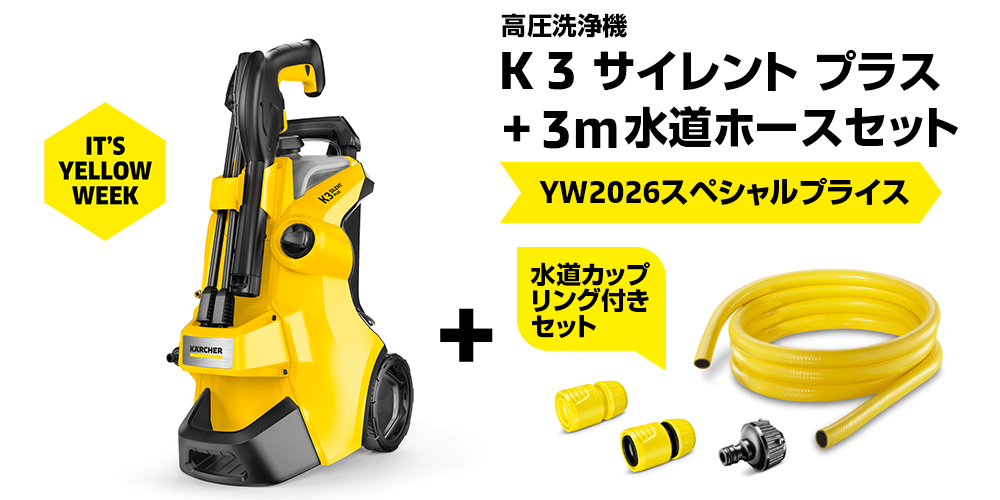 住宅街でも時間を気にせず使える水冷式静音モデルの高圧洗浄機「K 3 サイレント プラス」には、届いたその日にすぐ使える「3m水道ホース(カップリング付)」をもれなくセットにしてお届け!