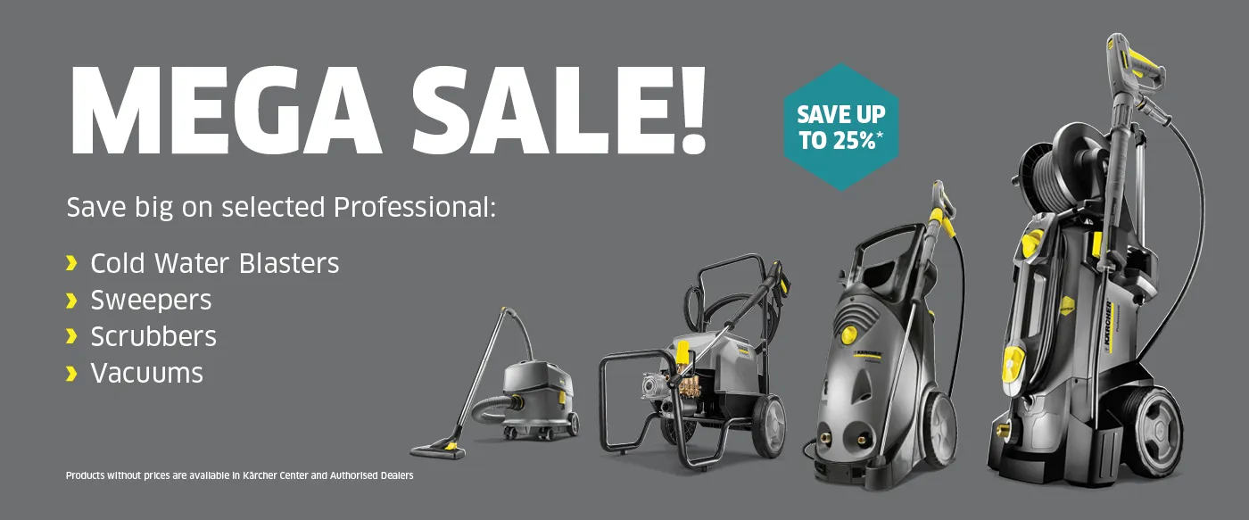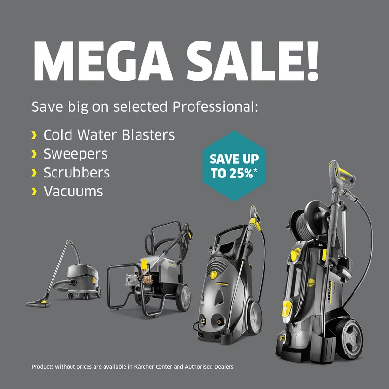 Kärcher Mega Sale is live! Save up to 25% on selected Cold Water Blasters, Sweepers, Scrubbers and Vacuums!