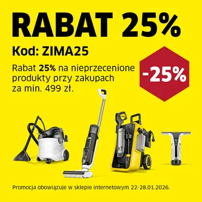 Tylko w dniach 22-28 stycznia 2026, z kodem rabatowym ZIMA25 zyskaj upust 25% na zakup wybranych, nieprzecenionych urządzeń, akcesoriów i detergentów przy zamówieniu za minimum 499 zł brutto. Promocja obowiązuje w sklepie internetowym karcher.pl