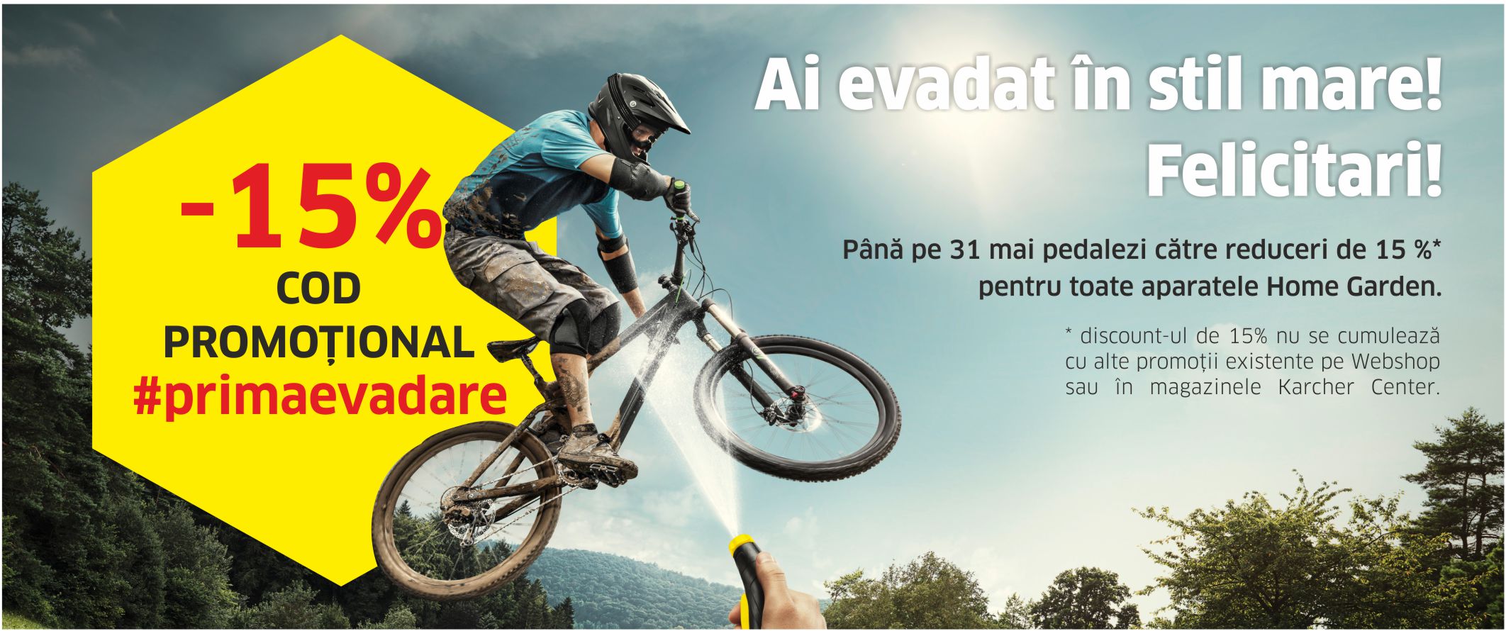 Până pe 31 mai 2018 participanții la evenimentul Prima Evadare beneficiază de un discount de 15% pentru toate aparatele Home&Garden la achizițiile pe www.karcher.ro sau la orice magazin Karcher Center din București și din țară, cu condiția că produsul achiziționat să nu se afle deja într-o altă promoție. Discount-ul de 15% nu se poate cumula cu alte promoții pe www.karcher.ro sau în magazinele Karcher Center.