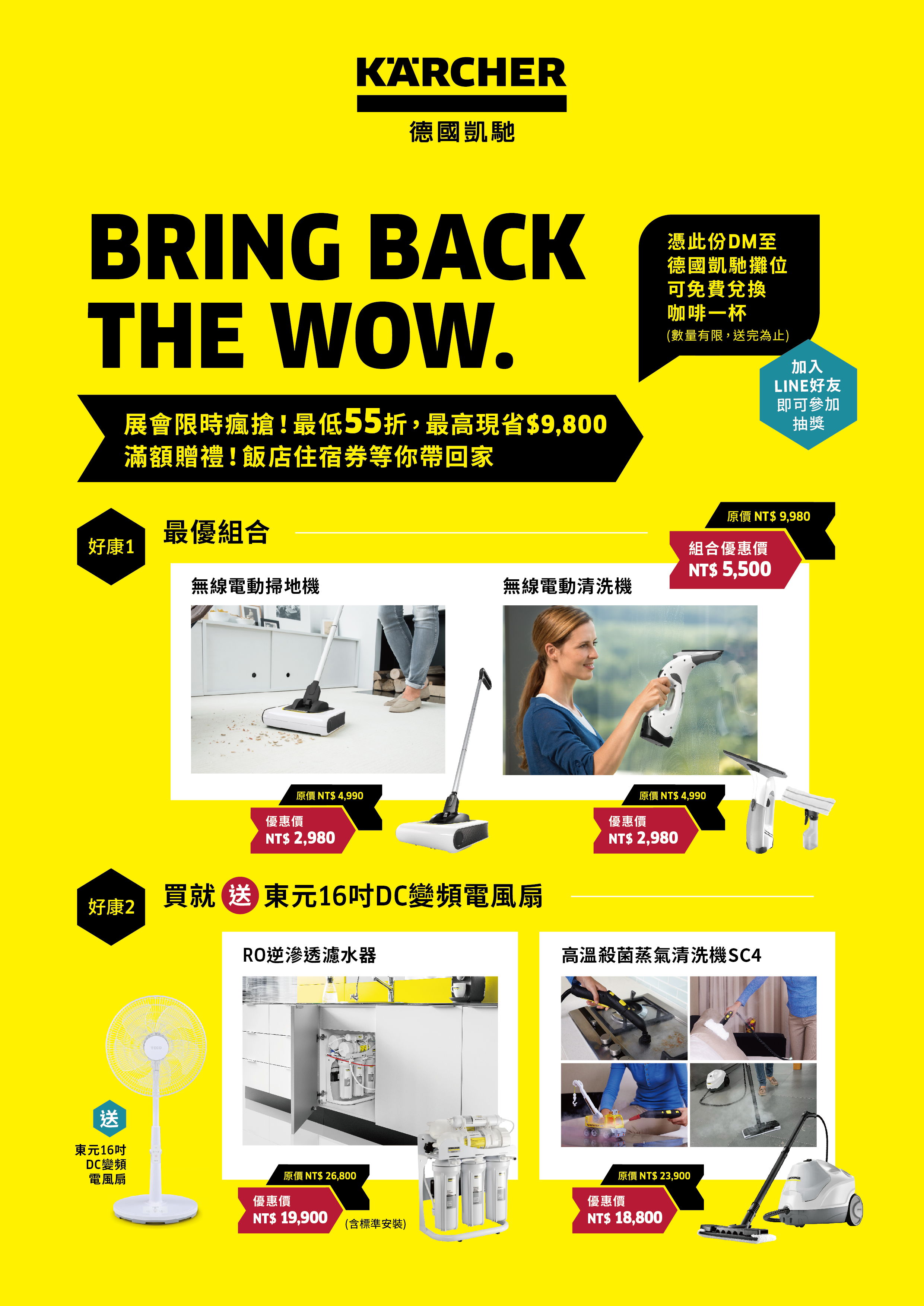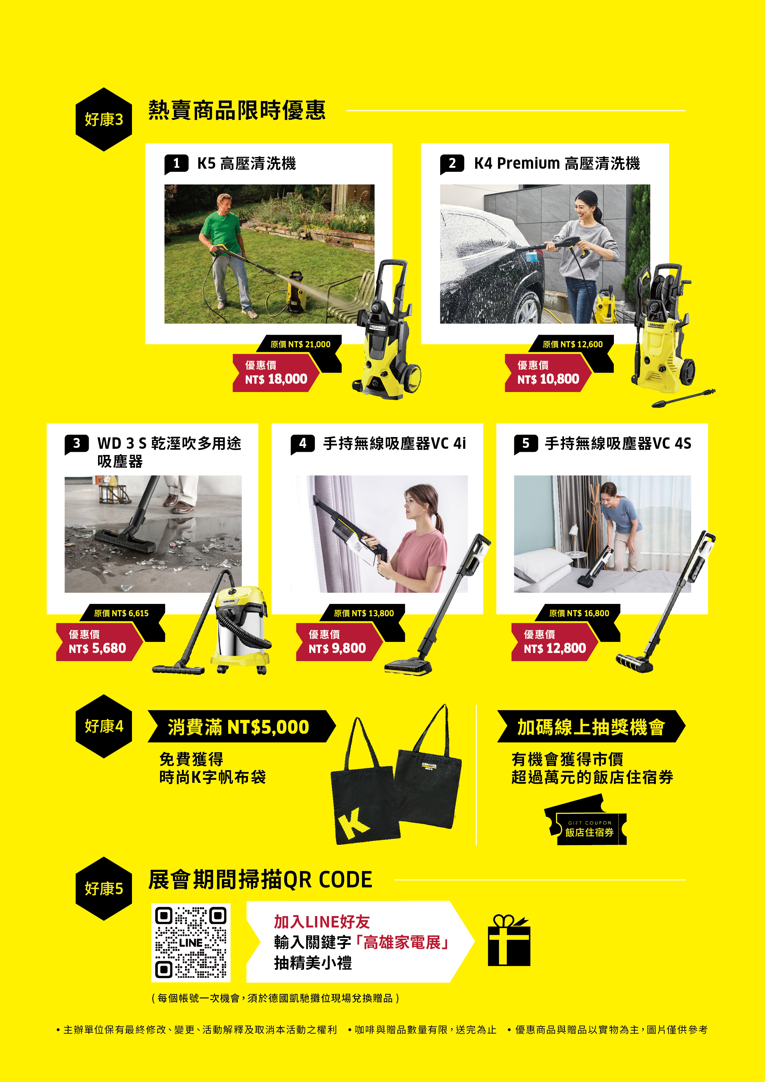 亮點四、德國凱馳攤位消費滿NT$5,000,免費贈送精美小禮,加碼線上抽萬元飯店住宿券。