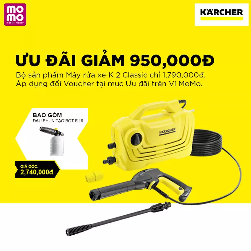 Thẻ quà tặng giảm giá 950.000đ chỉ áp dụng duy nhất đối với bộ sản phẩm "Máy phun rửa lực K2 Classic và Đầu phun bọt tuyết FJ 6 của Kärcher"